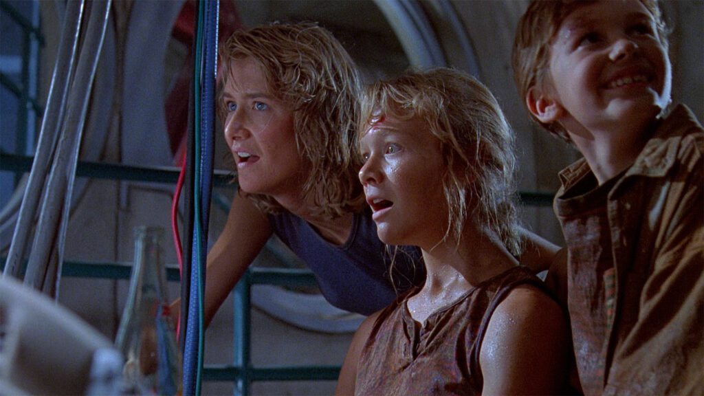 RICHARDS: The whole T. rex paddock scene was really something. I remember the days filming that with the giant wind machines and the rain machines and that incredible dinosaur model. As I’ve gotten older and I look back on the beauty of the dinosaur models that Stan Winston’s team made, it just blows me away. To realize that I got to work with this dinosaur right up close as my co-star in the scene, where I got to react, playing off of it.