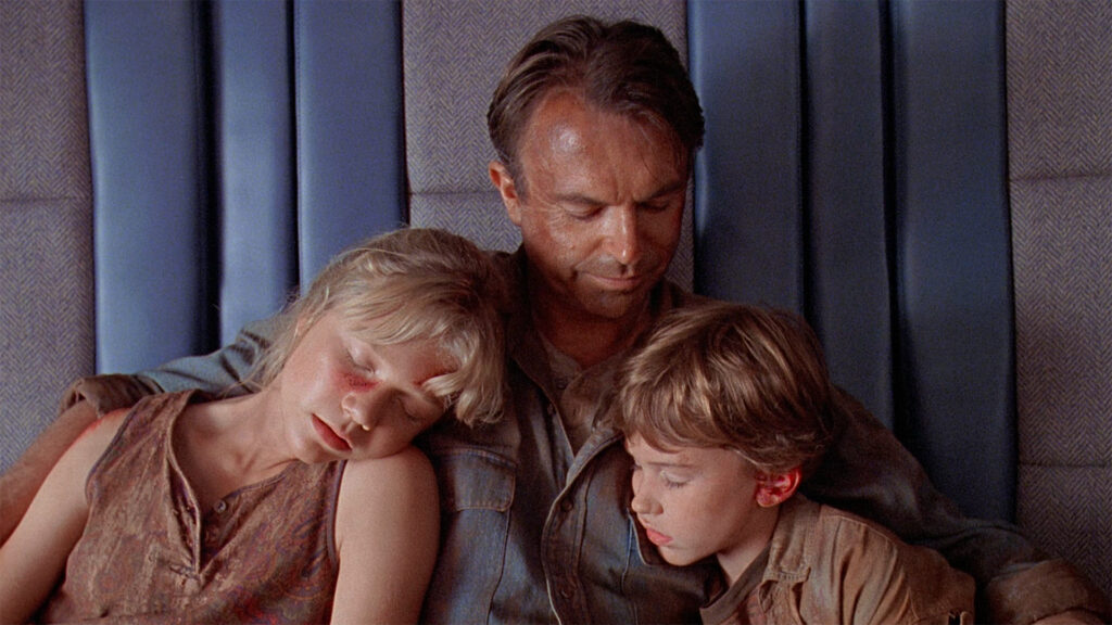 RICHARDS: Sam played a great Alan Grant. He was really reserved and calm, personality-wise, he never seemed to get ruffled about anything… I have a funny story about Sam. We’re there filming the T. rex paddock scene and I’m on the top of the wall with Sam. He was supposed to hold on to me and we were going to lean back and go down a wire, down the side of the wall. I misunderstood, and I thought we were going to continue on through the whole scene and actually hold onto the wire, back up and go completely off camera down onto this mattress below. Apparently, we were supposed to cut before that, but I leaned back and pushed both of us over the edge and Sam and I landed on this big old mattress right below. Sam was so surprised. We were fine, but I think my mom got a pretty big shock when she saw me disappear off-camera when she was watching the monitor. She looked over at Steven, noticed he was laughing. She was trying to figure out what in the world was happening to her daughter, just went over the edge, but Steven knew it was fine. I wasn’t afraid at all during the segment of going down the wire with Sam in the T. rex paddock. We always blocked everything really carefully when it came to us working with the stunt people. I felt confident and everything was fine. I guess I felt too confident because I proceeded to continue on to the next part of the scene. [laughs]